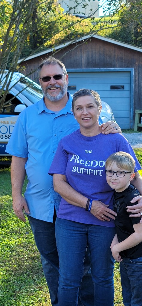 Now let me tell you a little about what happened in the midst of our remodeling project. I became very sick and weak. On April 28, 2021, I woke up with several bruises on different areas of my body. I quickly dismissed them as bumping into things while we worked at the house. However, the extreme fatigue was not as easily dismissed. The next day, I woke up to twice as many bruises all over and petechiae, which is broken capillaries, characterized by small red dots that covered both my lower legs. That morning, I didn’t have the strength to stand in the shower. My husband got up and I showed him the bruises and petechiae and he ordered me to go straight to the doctor. He went to work, and I called the doctor and thank God, they got me in at 8:30 am. I remember being so weak as I drove myself there. I explained my symptoms and the nurse practitioner looked at the bruising and petechiae. She ordered blood tests. I passed out while the nurse was drawing my blood. I laid down there for 30 minutes or so and got up to try to get myself in my car to drive home. I remember reaching for the car door handle to close my door and it being so painful. The world I knew of newly wed bliss and remodeling our home was coming to a screeching halt! Nothing else mattered but crying out to God to give me strength and give us both direction. My husband came home about 20 minutes after I arrived back home to inform me that there were critical levels in my blood work and that we needed to go to the Emergency Room right away. I tried to tell him that if I just could get some rest that I would be fine. He asked me where my suitcase was, and he went to pack it for me. At that moment, I knew it was serious, however, I never thought I would get the diagnosis of cancer. Our local hospital tried to treat me, but my body would have a reaction to the platelets (mine were at 11 platelets and normal is 1,500 to 4,500). That explained the extreme fatigue. The doctors also gave me blood and tried to get my white blood cell count down and my hemoglobin up. But everything they did to treat my symptoms sent me backwards. The doctors began searching to find me a bed at a hospital that specializes in blood cancers. I was transferred to Huntsville Hospital on May 2, 2021. As soon as they wheeled me in a room, my body again went into shock. My heart and lungs were shutting down because my blood was not producing enough oxygen to sustain life. BUT thank you God that I arrived in time for a team of specialists to treat me! My husband of 4 months was faced with making a decision that no one ever wants to make. The doctor told my husband that in order to save my life, he needed to put me on a ventilator and intubate me. My husband asked for 5 minutes to pray and call our pastor to pray. Our pastor agreed and heard from God that Bill should do whatever it took to save my life. May 2, I was placed in a medically induced coma on a ventilator, intubated, and on a feeding tube. I know it was horrifying for my children, my family, and my husband to see me in that state. BUT God used this to not only save my life but to speak to me spirit-to-spirit. The realm that I was in was so peaceful! I saw angels hovering all around my body and a brilliant white light was hovering over my body from head to toe! My spirit was speaking directly to God! I asked God, “Where am I? Am I in Heaven?” God said, “No, you have more assignments on earth.” I said, “Then why are there angels all around me?” God said, “The prayers of the saints brought the angels to administer quick healing to you.” I then asked, “God please tell my husband and my daughter!” God said, “You and your husband are one flesh, so as I’m telling you, he is receiving revelation of your healing and that you will recover.” As for your daughter, her prayers will be answered because you will be able to breathe on your own and come out of the coma and off the ventilator before Mother’s Day. Every word God spoke to me was fulfilled. His Word does not return void Isaiah 55:11)! However, it is up to us to believe Him and NOT walk in fear. That “perfect peace” stayed with me and my husband throughout my hospital stay and 7-month journey to complete healing! I defied the odds in every way! I gained all my weight back. We prayed daily against the side effects that chemo treatments sometimes cause, and God was faithful to answer our prayers! Today, I continue to claim and walk in my healing! The medical field calls it total remission, but that would suggest that it might come back. I believe that I am healed today and forever! The stripes that Jesus took on his back to purchase mine and your healing will NEVER lose their POWER! I refuse to walk in fear of what might happen or give any of my valuable time to the enemy!